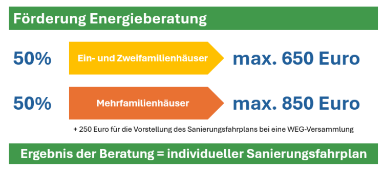 • zusätzliche Förderung für WEG: 250 Euro einmalig pro WEG bei Erläuterung der Beratungsergebnisse im Rahmen einer Wohnungseigentümerversammlung