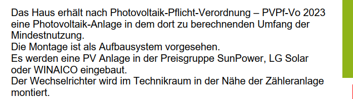 Die Photovoltaikanlage ist nur rudimentär beschrieben, die Leistung der Anlage ist für einen Laien nicht erkennbar. Hier weiß man also nicht was man kauft.